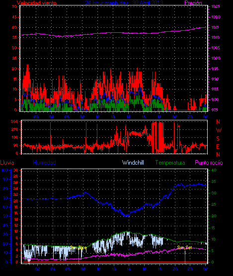 Maxima ráfaga viento= 22.2 km/h de 090°( E ) en dia 30 a la hora 00:57