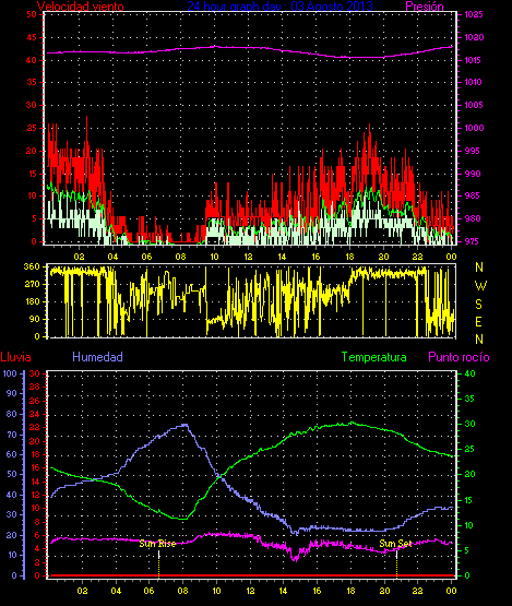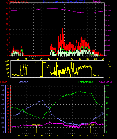 Maxima ráfaga viento= 31.5 km/h de 338°(NNW) en dia 03 a la hora 00:05