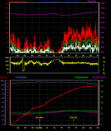 Maxima ráfaga viento= 31.5 km/h de 203°(SSW) en dia 02 a la hora 23:54