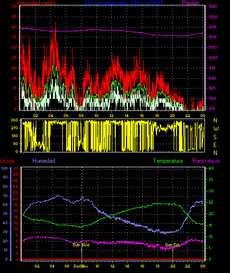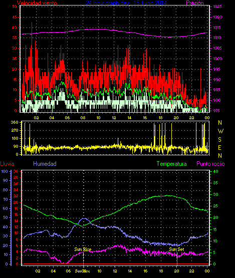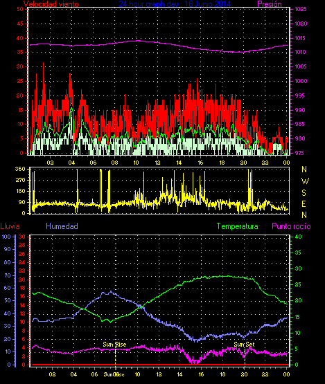 Maxima ráfaga viento = 44.4 km/h from 045°( NE) en dia 15 a la hora 01:23
