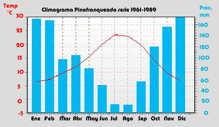El clima de Pinofranqueado se encuentra influenciado por la orografia, con un clima mediterráneo Csa dentro de la clasificación köppen, presentando un verano cálido con temperaturas medias en estos meses por encima de 22ºC coincidiendo con la sequía estival, y un invierno fresco con una temperatura media para el mes mas frío de 6,2ºC. Ahora bien aunque encaja dentro clima mediterráneo Csa, tiene matices importantes que le imprimen un carácter propio como las elevadas precipitaciones durante el otoño e invierno, que elevan la precipitación media hasta los 1207 mm, sin duda debido a la influencia Atlántica combinada con la orografia, por lo que se aprecia un cierto carácter de transición hacia los climas oceánicos Cfa Y Cfb, por otro lado la temperatura del mes mas frío es de 6,2ºC, debida en parte a la continentalidad, y sin duda debido a la situación de Pinofranqueado en el fondo de valle que hace que sea favorable a la formación de inversiones térmicas, y por tanto a las heladas de irradiación , que aunque no permite englobar al clima dentro de la variante Csa con invierno frío (A. López), pues esta categoria engloba aquellos climas cuya temperatura media en el mes mas frío es inferior a 6ºC, hace que se aproxime, por lo que podríamos decir que se trata de un clima mediterráneo Csa, con una marcada influencia Atlántica y cierta continentalidad que hace que tengamos unos inviernos frescos.